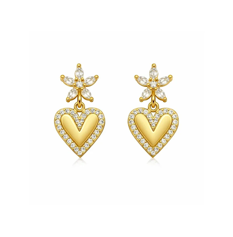 Elevate your style with our Elena Bloom Heart Drop Earrings, a stunning blend of romantic sparkle and floral charm. These gold-plated beauties feature a pastel crystal-petal flower paired with a dimensional heart drop outlined in brilliant cubic zirconia for maximum shine. Lightweight, elegant, and gift-ready — the perfect pair for Mother s Day, birthdays, or everyday glamour.
