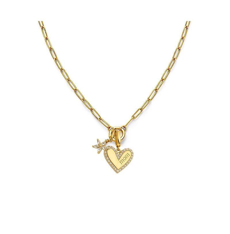 Celebrate Mom with timeless sparkle and modern elegance. The Sabrina Bloom Mom Heart Necklace features a gold-plated paperclip chain, a pave-outlined dimensional heart engraved with ""mom,"" and a delicate crystal-petal flower charm for a soft, feminine touch. This meaningful piece brings together love, shine, and everyday wearability-perfect for Mother's Day, birthdays, or simply showing her how much she means to you.