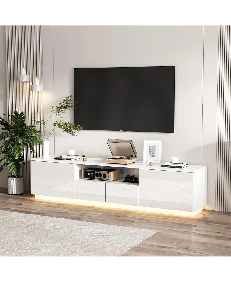 The White High-Gloss 4-Drawer Tv Cabinet is a high-end storage furniture designed for the modern family living room, which stands out for its simple yet luxurious design style and excellent functionality. The Tv cabinet adapts to the size of most TVs, and at the same time provides a rich storage space to meet the diverse storage needs of family members. In addition, the bottom is equipped with a monochrome warm white light strip, which not only enhances the visual effect, but also adds a warm atmosphere to the living room.