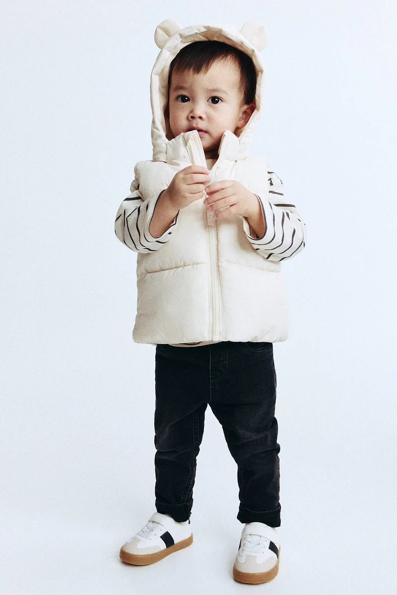 Padded vest. Detachable hood with ear-shaped appliqués, stand-up collar, and zipper at front with anti-chafe chin guard. Lined.