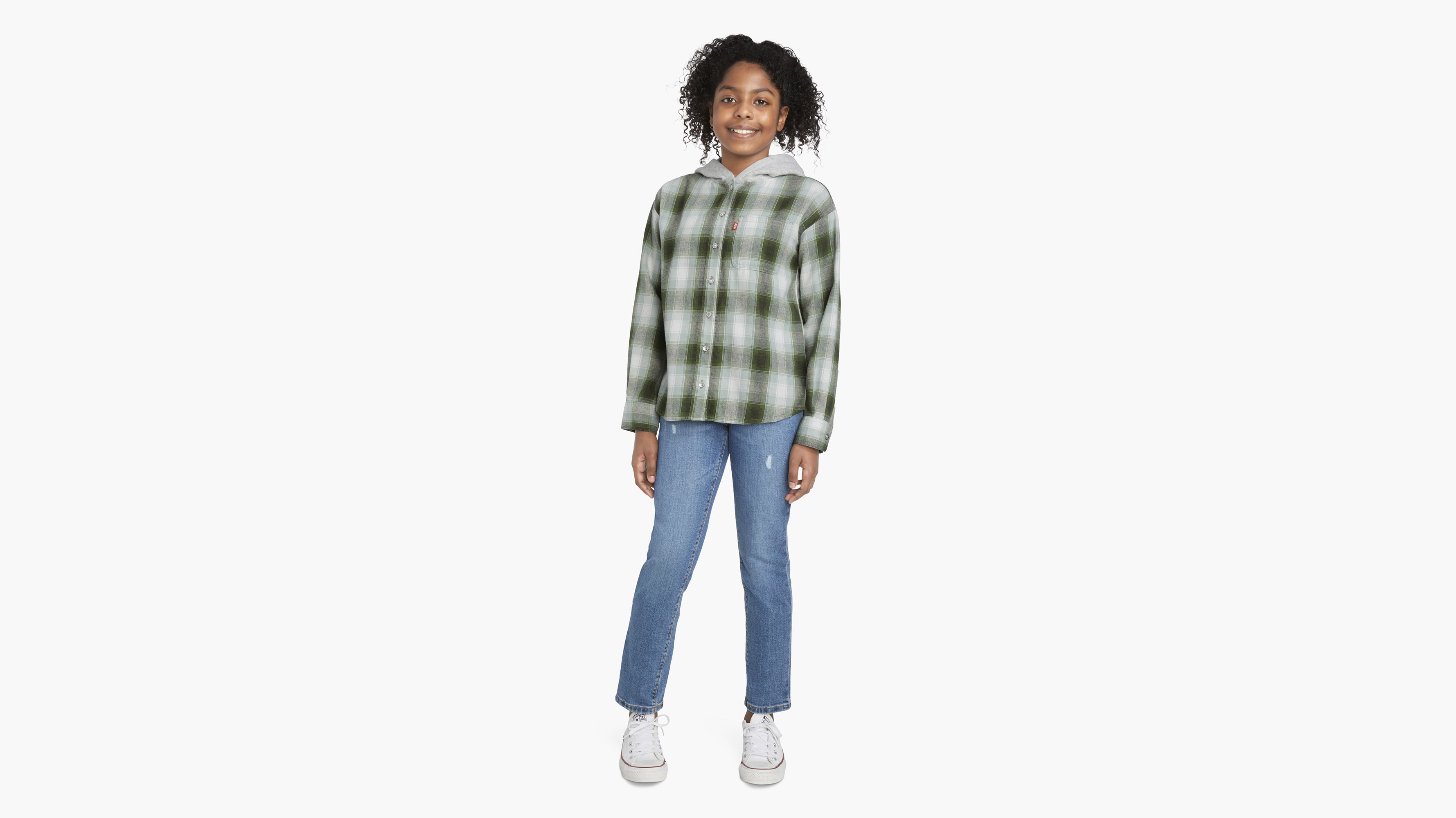 The Levi's® Woven Top with Hood is something between a hoodie and a plaid shirt. Inspired by the classic western shirt, this comfortable button-up is made of soft flannel, with a cozy terry cloth hoodie and a relaxed fit.