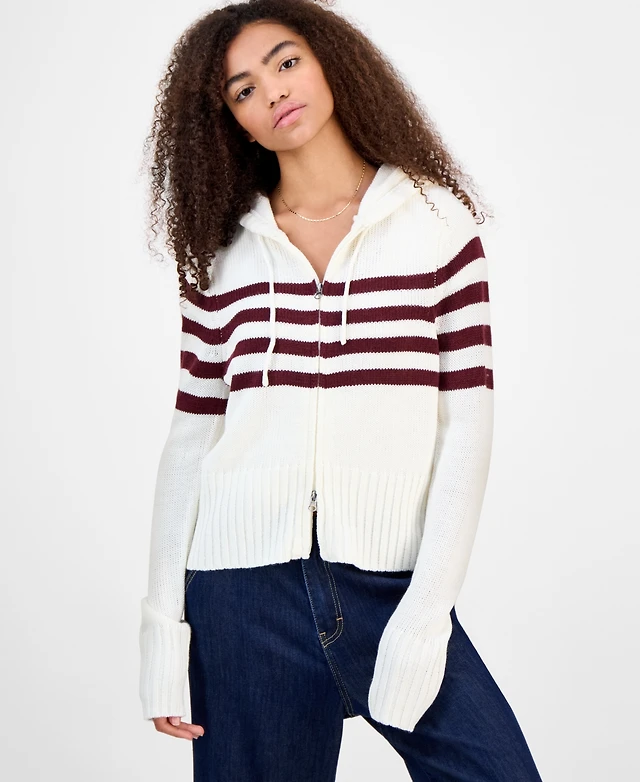 Hooked Up by Iot Juniors' Striped Hooded Zippered Sweater