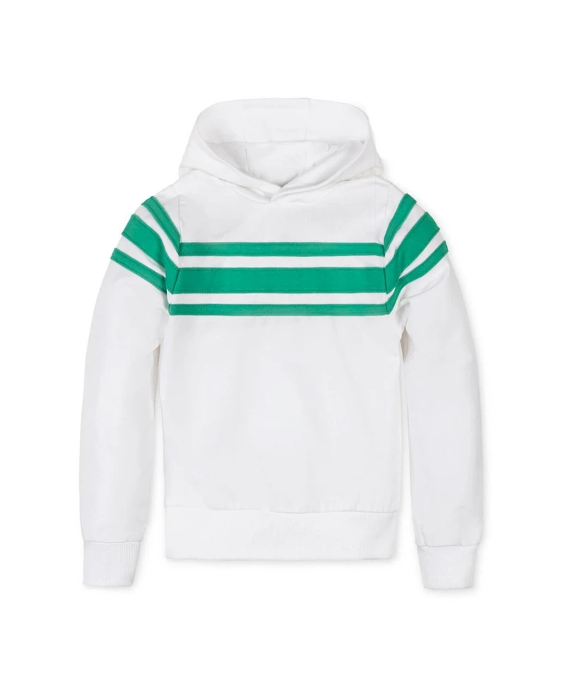 Our easy pullover hoodie is crafted from soft organic cotton French terry with comfort, practicality, and style in mind. Features athletic striping across the chest and sleeves, and a hood for extra warmth. Coordinates nicely with our matching shorts for a cute, sporty look.