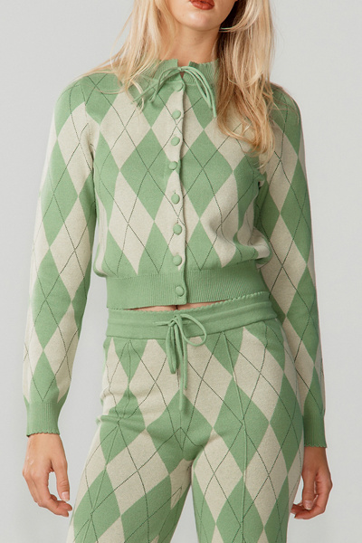 Preppy-meets-cozy House Of Sunny cardigan sweater designed in a 100% cotton knit featuring an argyle motif. Cropped cardigan featuring a crew neckline with tie-front bow detail, long sleeves, tonal buttons down the front and ribbed trims throughout. Perfect layered & on its own for endless ways to wear!