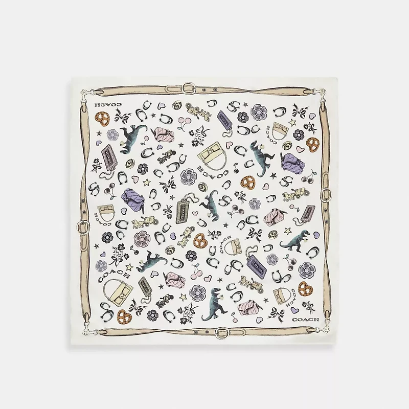 A celebration of Coach heritage, this square scarf features an array of our iconic Coach motifs bordered by our interchangeable leather bag straps print. Crafted of lightweight silk, it adds a distinctive touch to any look.