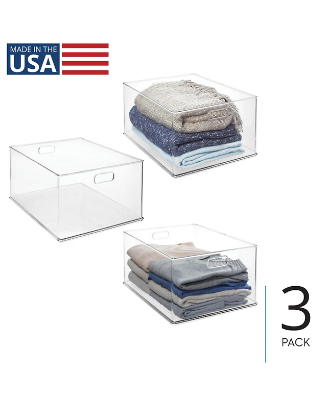 iDesign Stackable Plastic Storage Bin with Handles, Set of 3, Clear, Made in Usa