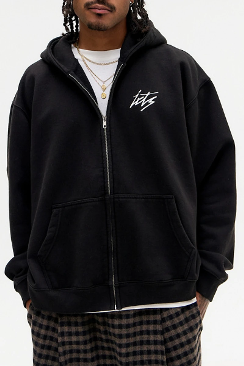 Zip front hoodie by iets frans... with an embroidered logo at the left chest. Hooded sweatshirt with a full zip closure front, hand pockets and ribbed knit trims. Available only at Urban Outfitters.