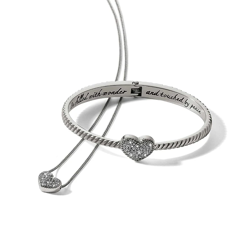 Etched into the band of the delicate Celestia Heart Bangle are the words Be filled with wonder and touched by peace. An Illumina Celeste Heart Petite Necklace will finish her look in a sparkling way.
