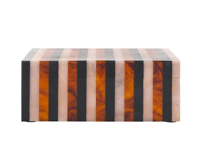 Introducing the Ina Decor Box Set of 2—a sophisticated and versatile addition to any room's decor. Available in a classic palette of black and brown, these rectangular boxes blend seamlessly with various styles and color schemes, making them suitable for countless interior settings.Crafted from resin and Mdf, these boxes offer a perfect balance of visual appeal and functionality. The striking striped pattern is not only eye-catching but also adds a touch of elegance and modernity to the design.Smartly designed to be both stackable and nestable, this set maximizes space without sacrificing style. Whether used together for a tiered effect or individually for dispersed accents, they effortlessly accommodate your storage and decorative needs.Add functional charm to your living space with these decor boxes that serve as both stylish statement pieces and practical storage solutions. Transform your decor today with the Ina Decor Box Set!