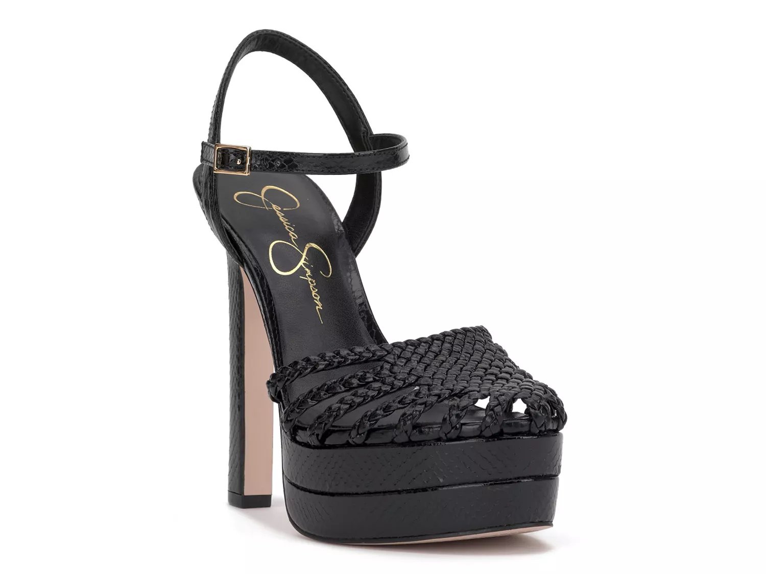 Boost your fashion quo with the Inaia platform sandal from Jessica Simpson. Multiple braided straps on the vamp and snakeskin patterned slingback strap punctuate this dress sandal elevated with a stunning covered heel.
