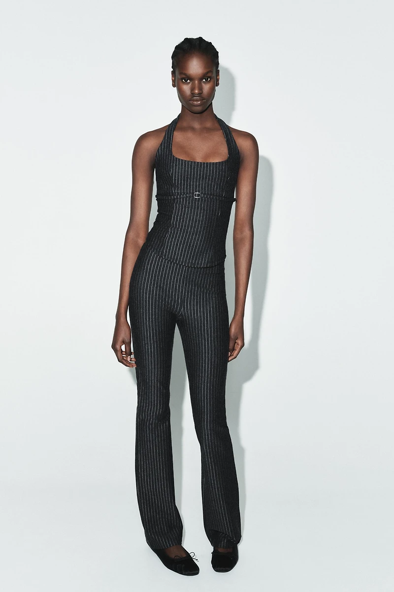 High-waisted pants made of elastic and flexible knit fabric with a compact, soft, and opaque weave. Flared hem.
