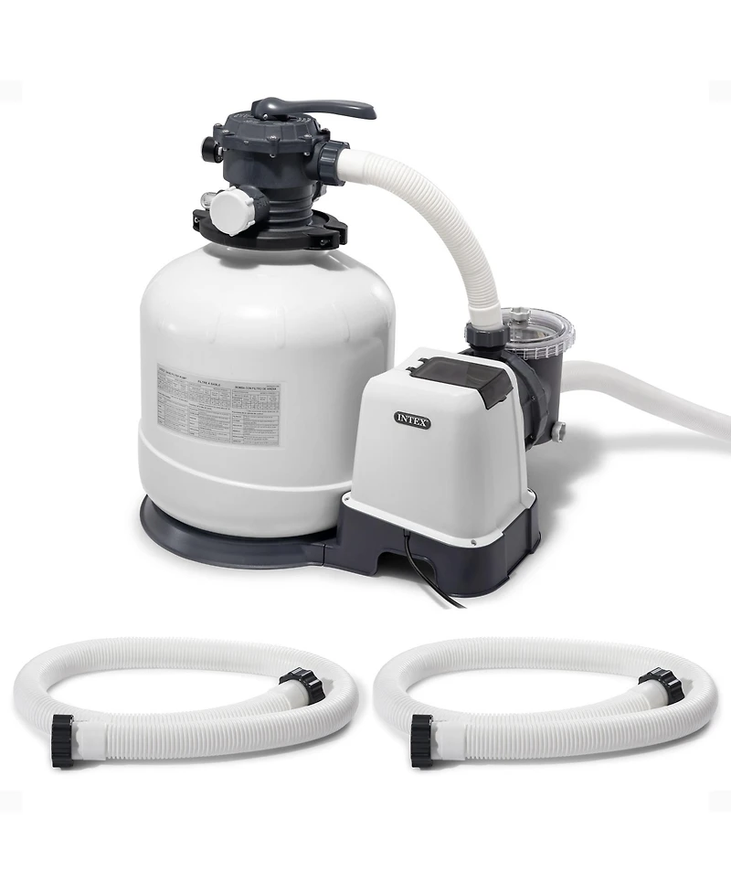 The Intex 3000 Gph Above Ground Pool Sand Filter Pump with Automatic Timer provides cool, refreshing, clear water, and less hassle every swim season.If you are tired of buying and replacing pool filter cartridges, this filter is the one for you. With virtually no maintenance, your sand pump only needs replacement every five years.This sand pump features a powerful motor, 6-function control, and a built-in automatic timer. It meets the Ul standards and is an excellent upgrade to the filter cartridge system on your Intex Above Ground Swimming Pool (Easy Set, Metal Frame, and Ultra Frame -- up to 19,600 gallons).This package also includes a 2-pack of Intex 1.5-Inch Diameter Pool Pump Replacement Hoses. These Intex replacement hoses are suitable for 1500 gallons per hour and higher filter pumps and saltwater systems with the correct size fittings. This accessory hose comes complete with nuts on both ends making installation fast and easy.