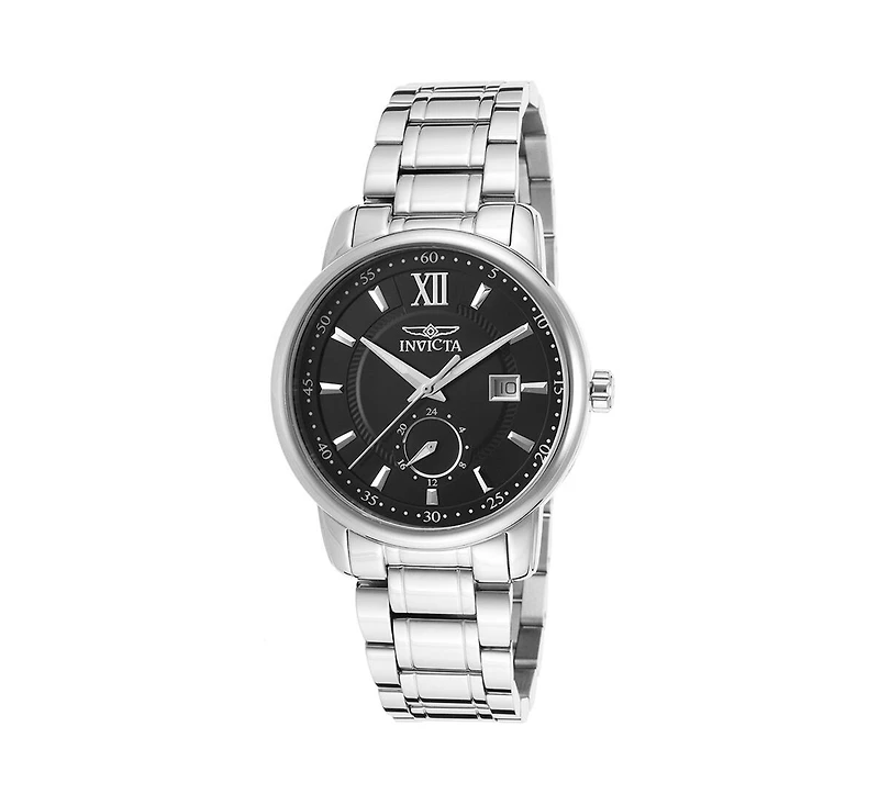 Silver-tone stainless steel case with a silver-tone stainless steel bracelet. Fixed silver-tone stainless steel bezel. Black dial with silver-tone hands and Roman numeral and index hour markers. Tachymeter scale around the outer rim. Dial Type: Analog. Date display at the 3 o'clock position. 24 hour subdials. Isa Caliber 9232/1940 quartz movement. Scratch resistant sapphire crystal. Pull / push crown. Solid case back. Round case shape. Case size: 40 mm. Band width: 20 mm. Fold over clasp. Water resistant at 100 meters / 330 feet. Functions: date, Gmt, second time zone, hour, minute, second. Casual watch style. Watch label: Swiss Movt. Invicta Specialty Black Dial Men's Watch 18083.