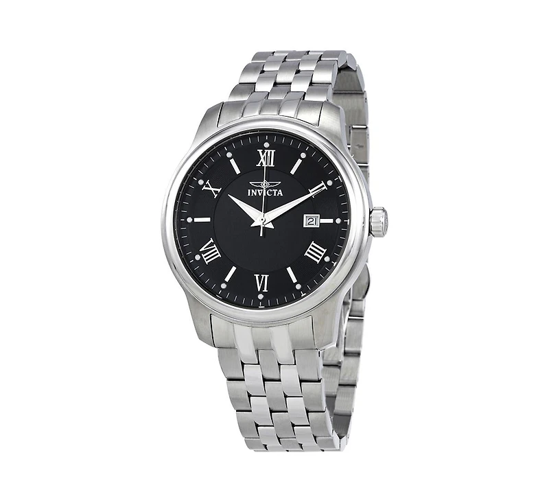 Silver-tone stainless steel case and bracelet. Fixed silver-tone bezel. Black dial with luminous silver-tone hands and alternating Roman numeral and index hour markers. Minute markers around the outer rim. Dial Type: Analog. Luminescent hands and markers. Date display at the 3 o'clock position. Caliber 515 quartz movement. Scratch resistant sapphire crystal. Pull / push crown. Solid case back. Case size: 45 mm. Case thickness: 10 mm. Round case shape. Band width: 22 mm. Band length: 7.65 inches. Fold over clasp with a safety release. Water resistant at 100 meters / 330 feet. Functions: date, hour, minute, second. Additional Info: in general, suitable for swimming and snorkeling, but not diving. Sport watch style. Invicta Vintage Black Dial Stainless Steel Men's Watch 23012.