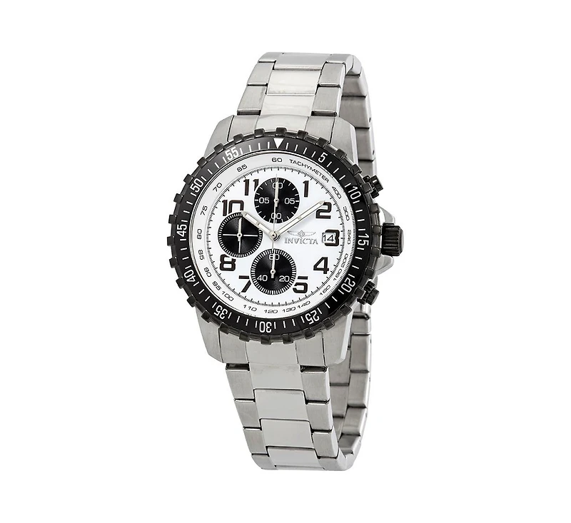 Silver-tone stainless steel case with a silver-tone stainless steel bracelet. Uni-directional rotating black ion-plated bezel. White dial with luminous silver-tone hands and Arabic numeral hour markers. Second markers on bezel. tachymeter markings around the outer rim. Dial Type: Analog. Luminescent hands and markers. Date display at the 3 o'clock position. Chronograph - three sub-dials displaying: 60 second, 60 minute and 1/10th of a second. Hattori Caliber VD57 quartz movement. Scratch resistant flame fusion crystal. Pull / push crown. Solid case back. Round case shape. Case size: 45 mm. Band width: 22 mm, band length: 8.25 inches. Fold over with safety release clasp. Water resistant at 100 meters / 330 feet. Functions: chronograph, date, hour, minute, second, tachymeter. Additional Info: suitable for snorkeling, as well as swimming, but not diving. Casual watch style. Invicta Pilot Collection Chronograph White Dial Stainless Steel Men's Watch 5999.