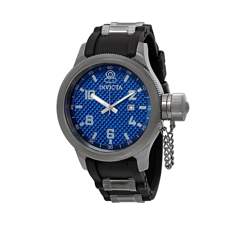 Gunmeteral Pvd stainless steel case with a black polyurethane rubber strap with gunmeteral Pvd barrel inserts. Fixed gunmeteral Pvd bezel. Black dial with luminous silver-tone hands and alternating Arabic numeral and index hour markers. Minute markers around the outer rim. Dial Type: Analog. Luminescent hands and markers. Date display at the 3 o'clock position. Isa caliber 2331/103 quartz movement. Scratch resistant flame fusion crystal. Screw down crown. Solid case back. Round case shape. Case size: 52 mm. Case thickness: 15 mm. Band width: 26 mm. Tang clasp. Water resistant at 100 meters / 330 feet. Functions: date, hour, minute, second. Sport watch style. Invicta Russian Diver Black Dial Men's Watch 0555.