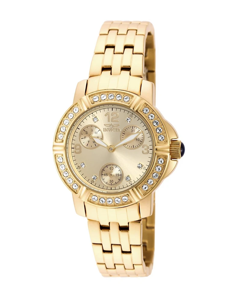 This eye-catching Invicta watch from the Angel collection is powered by an accurate Quartz movement, with a gold case. Its face is decorated by a gold, metal dial, and protected by a sturdy Flame Fusion Crystal. A gold, stainless steel band completes this timepiece that can resist water for up to 100 m. Patterns of ethereal energy connect time to a higher plane with the Invicta Angel collection. Harmonizing a perfect balance between time and style, watches of graceful diversity comprise Angel. Designed with a touch from above, Angel offers an array of selections to satisfy any mood, occasion, or taste. Highlighting the aspects of feminine prowess, the Invicta Angel collection knows no bounds, transcending earthly planes and achieving the ideal in keeping time. From its founding in 1837 to the present day, innovative excellence has been at the core of each collection throughout the history of Invicta.