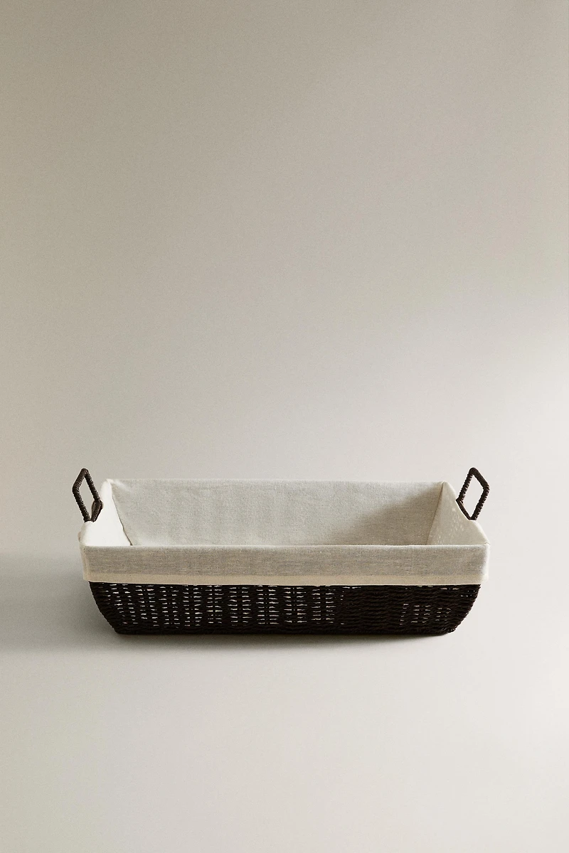 Storage basket for ironed clothes, elongated rectangular shape with a metal frame covered in resilient paper and side handles.