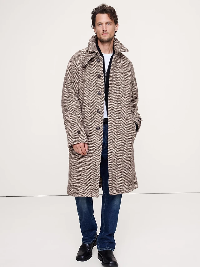 HERRINGBONE WOOL BLEND COAT WITH FAUX FUR COLLAR