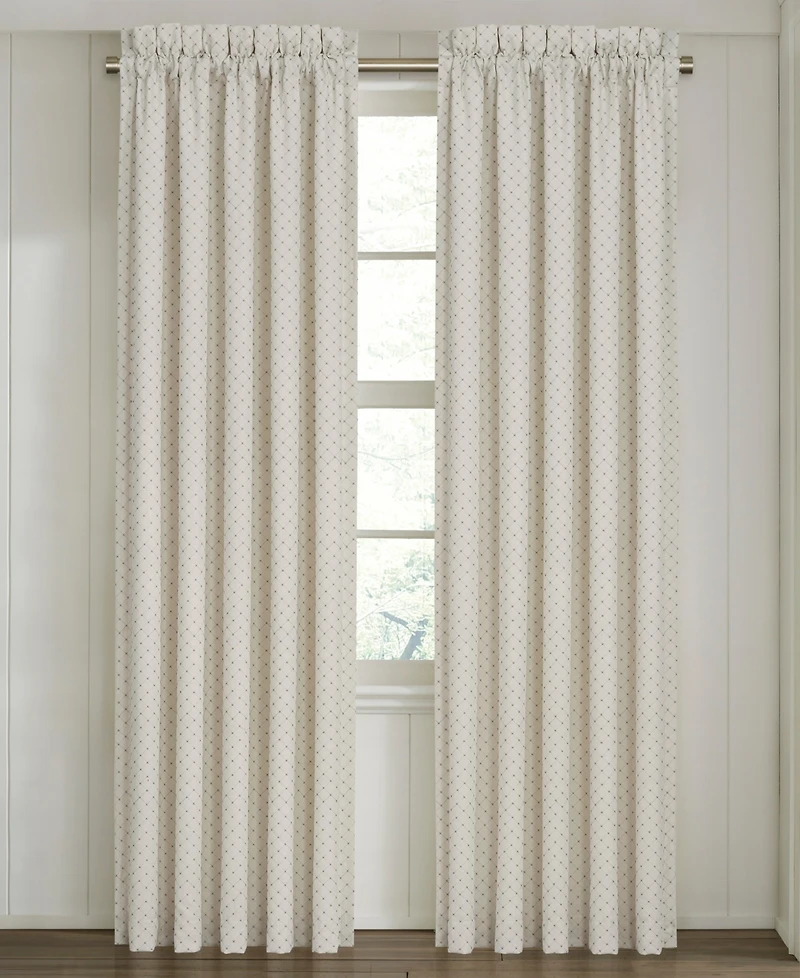 The Garden View window panel pair showcases a simple yet elegant diamond embroidery on an ivory textured fabric. Pair these panels with the Garden View window valance and bedding collection to complete your bedroom decor.