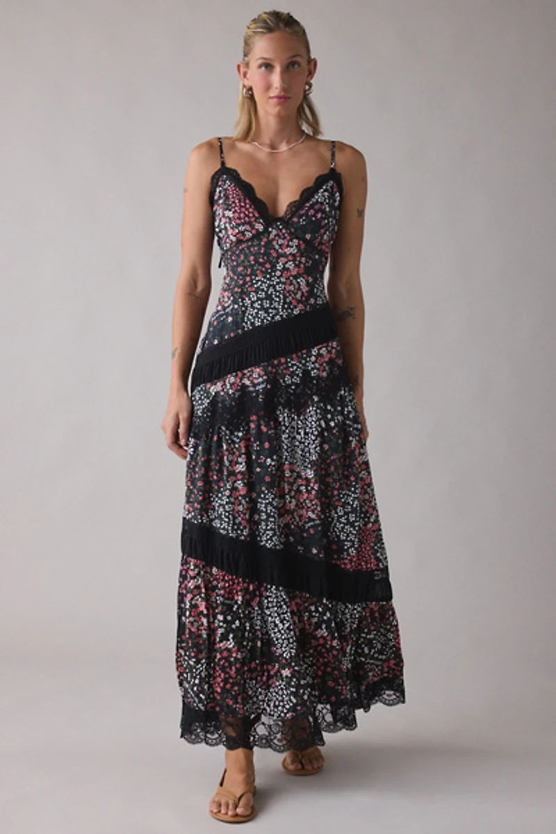 Floaty & femme Jacqie The Label maxi dress designed in lightweight, floral print chiffon! Long floral dress featuring a scalloped lace v-neckline, tie-straps and asymmetric lace trim details down the skirt for a modern, yet romantic vibe.