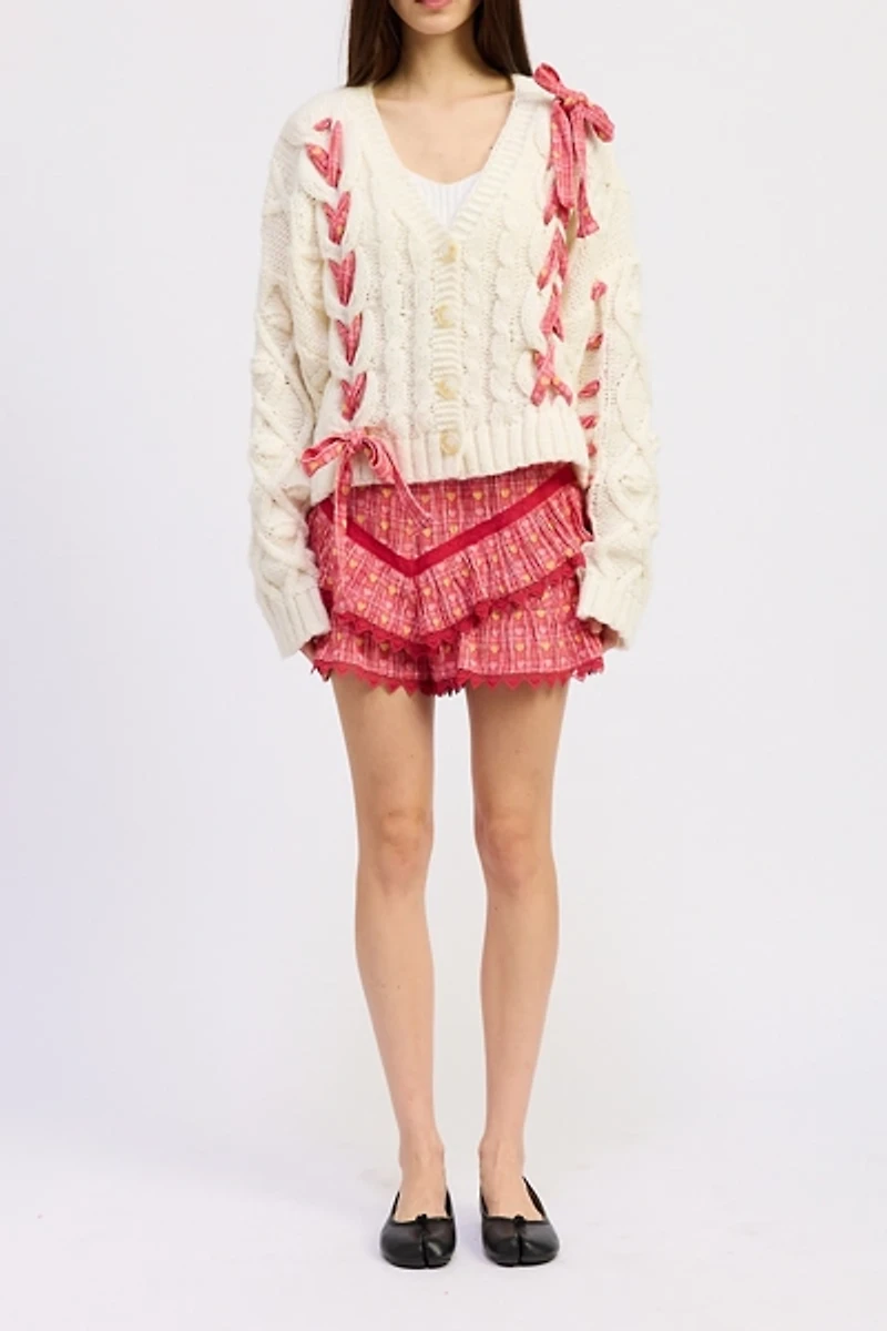 Cozy cable knit Jacquie The Label cardigan sweater made special with woven ribbon and bow details! Chunky cardigan featuring a v-neckline, slouchy drop-shoulder long sleeves and buttons down the front.
