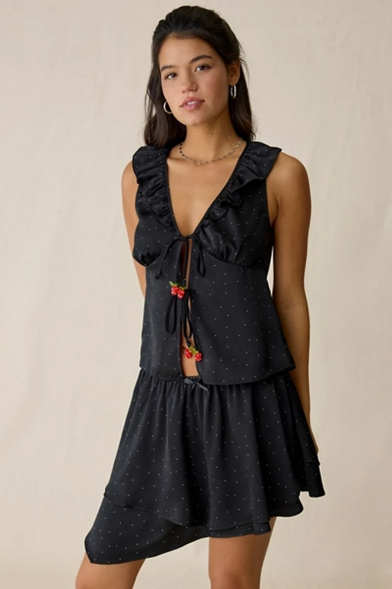 Chic, shine-finish satin Jacquie The Label tank top in a cropped fit. Split-front tank top featuring a plunging v-neckline with ruffle trim, sleeveless style, ruched bust, tie details down the front and flyaway hem. Finished with strawberry charm details for a berry sweet finish!