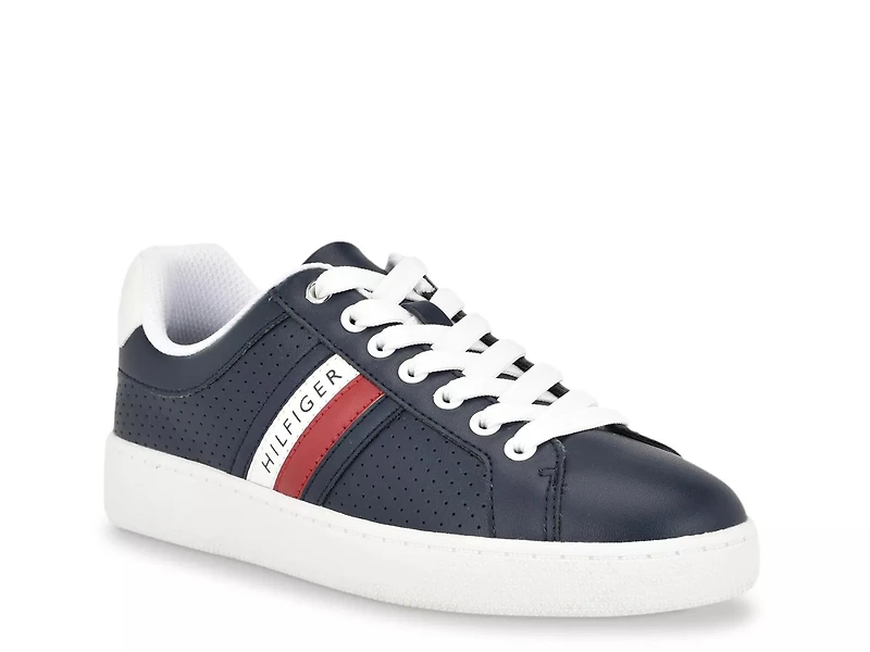 Look cool and classic in the Tommy Hilfiger Jallya sneaker. Perforated side walls with signature striped logo accentuate the style of this court-inspired sneaker designed with a foam footbed for comfort and wavy patterned sole for enhanced grip.