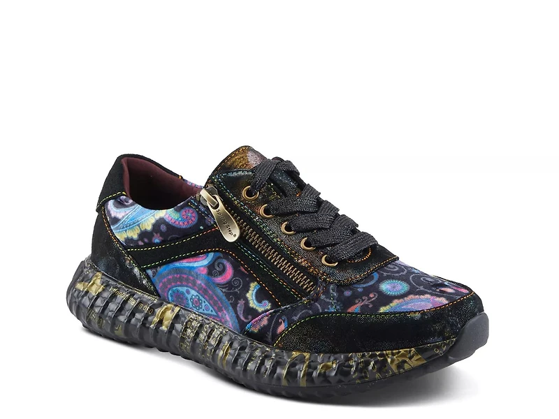 From weekend brunches to happy hours, the L'Artiste Javana sneaker is a sophisticated complement to your look. Attractive floral patterns and metallic lace accents on the vamp enrich this sneaker. Padded collar and cushy insole keep your feet comfortable throughout the day. Textured athleisure outsole provides a reliable grip.