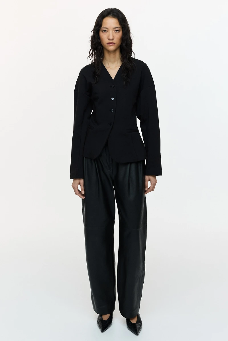 Fitted jacket in thick jersey with princess seams at front and back. V-neck, buttons to waist, mock welt front pockets, and dropped shoulders.