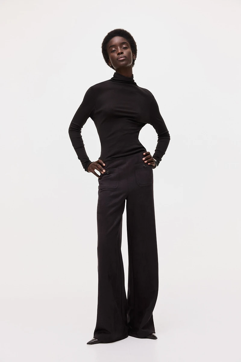 Pants in thick jersey with a soft, napped finish. Covered elastic at waistband, patch front pockets with button, and straight legs.