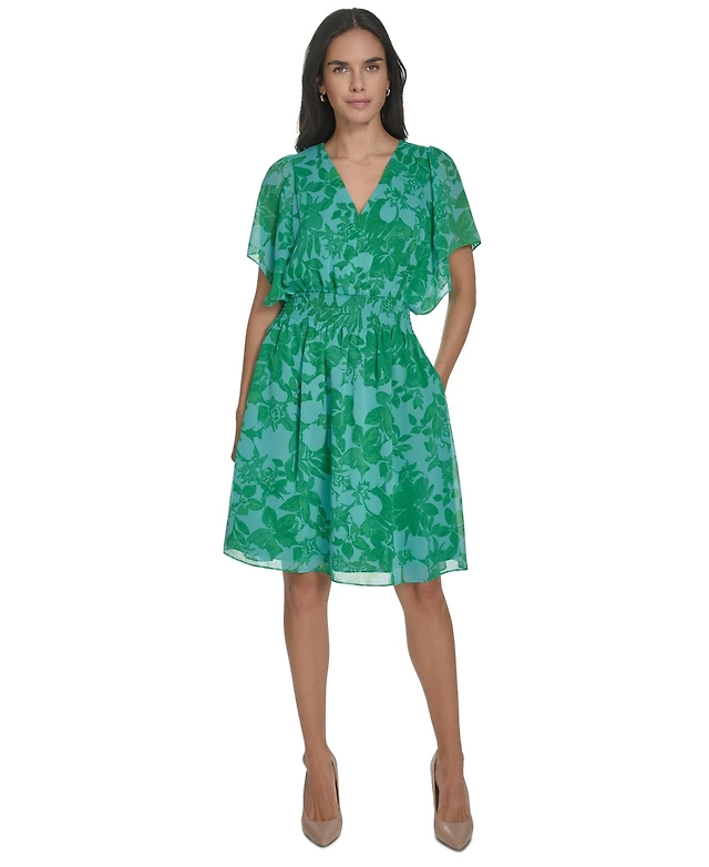 Jessica Howard Petite V-Neck Smocked-Waist Chiffon Dress