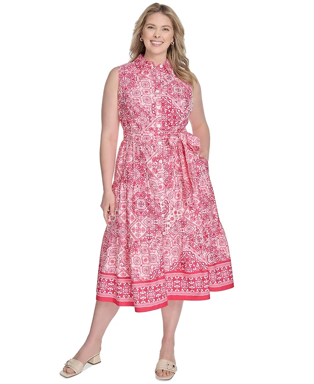 Jessica Howard Plus Printed Tie-Waist Sleeveless Midi Dress