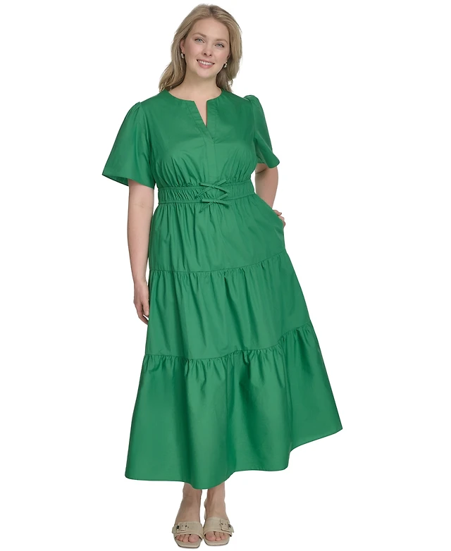 Jessica Howard Plus Size Cotton Tiered Split-Neck Maxi Dress