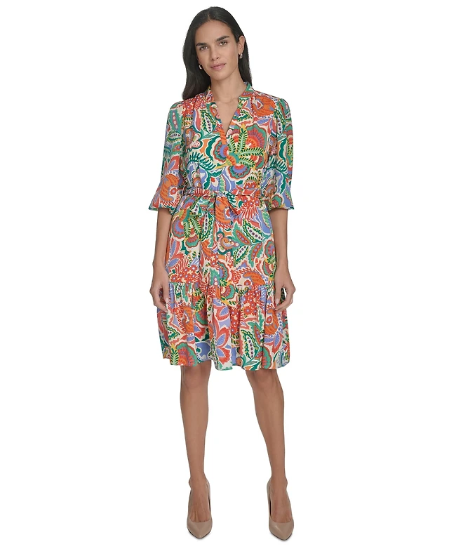 Jessica Howard Women's Cotton Printed Tie-Waist Shirtdress