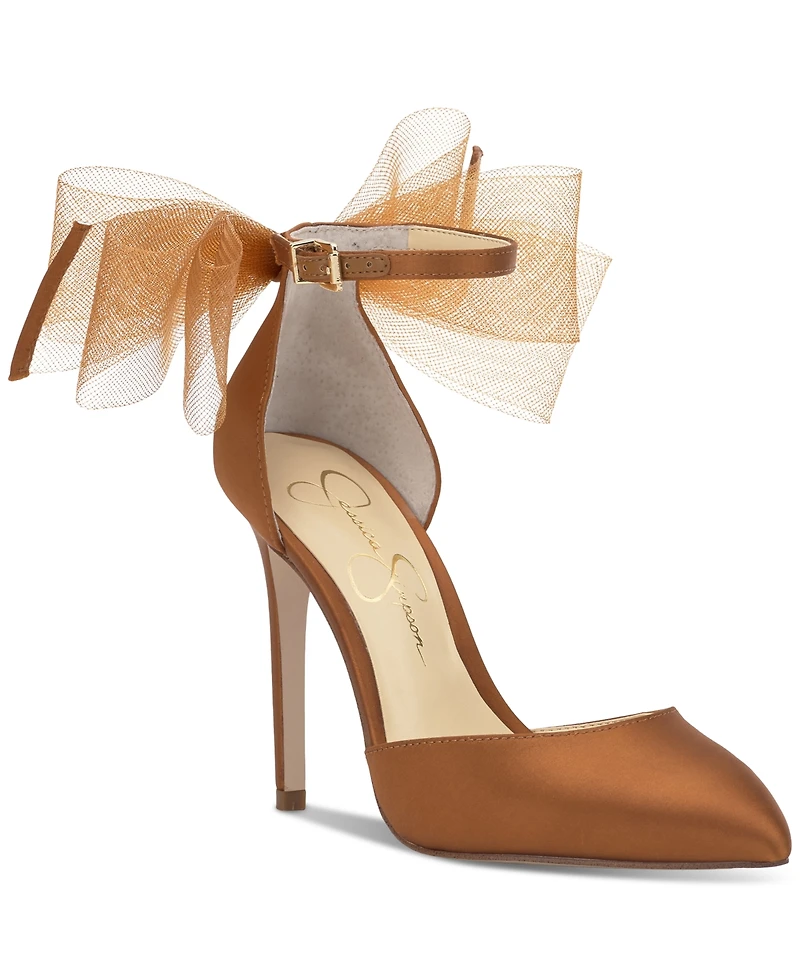 A two-piece design pairs with pointed toes and flouncy bows for a fun look over stiletto heels in the Phindies pumps from Jessica Simpson.
