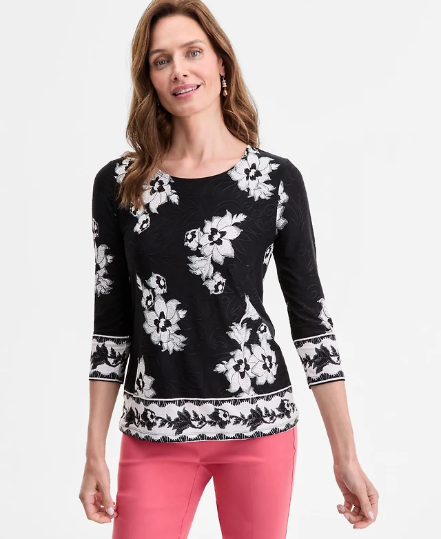 Jm Collection Women's Printed 3/4 Sleeve Jacquard Top, Exclusively at Macy's