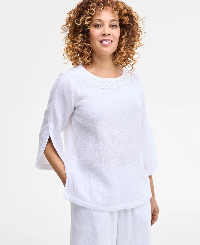 Jm Collection Women's Embellished Cotton Gauze Top, Exclusively at Macy's