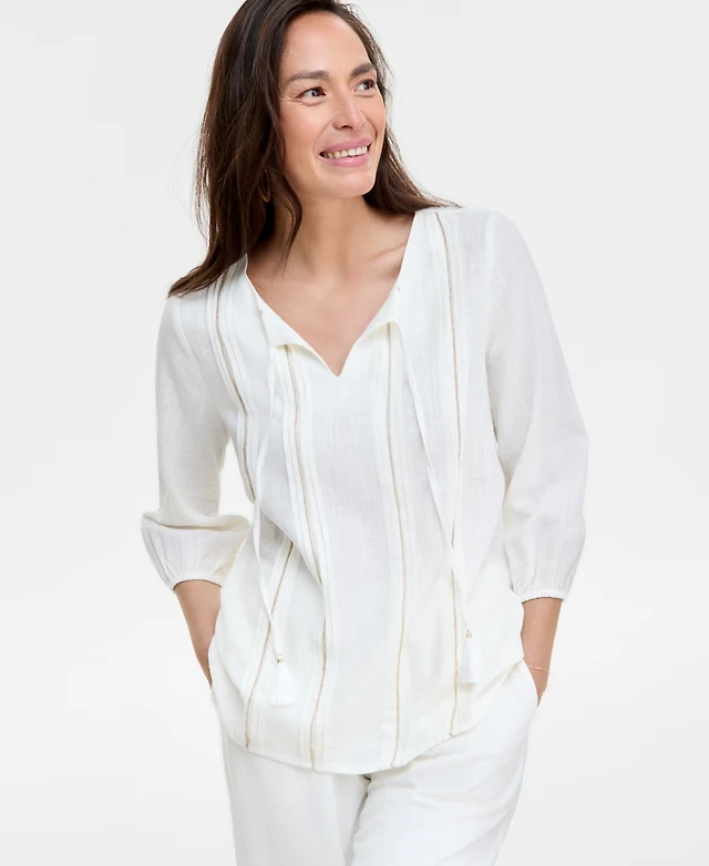 Jm Collection Women's Linen Blend Embroidered Pintuck Top, Exclusively at Macy's