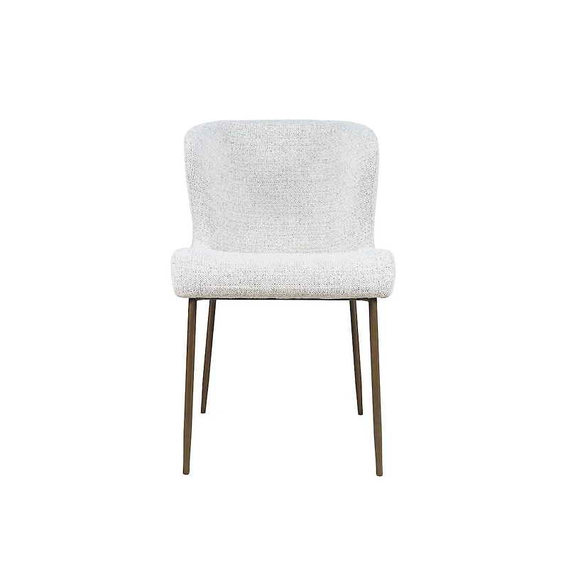 The Gibson Modern Upholstered Dining Chair blends everyday comfort with clean-lined sophistication. Wrapped in a soft, water-repellent performance fabric, the seat features a versatile woven blend of natural, grey, and black tones that pairs effortlessly with modern, transitional, or minimalist interiors. Gently contoured for support, the back and seat rest atop slim, tapered legs finished in antique brass—a warm metallic accent that adds subtle contrast to the soft fabric. Designed for durability and ease, the stain-resistant upholstery stands up to daily use while maintaining its refined look. Whether gathered around a wood table or styled as a standalone accent, Gibson brings elevated simplicity to your dining space. Sold as a set of two.