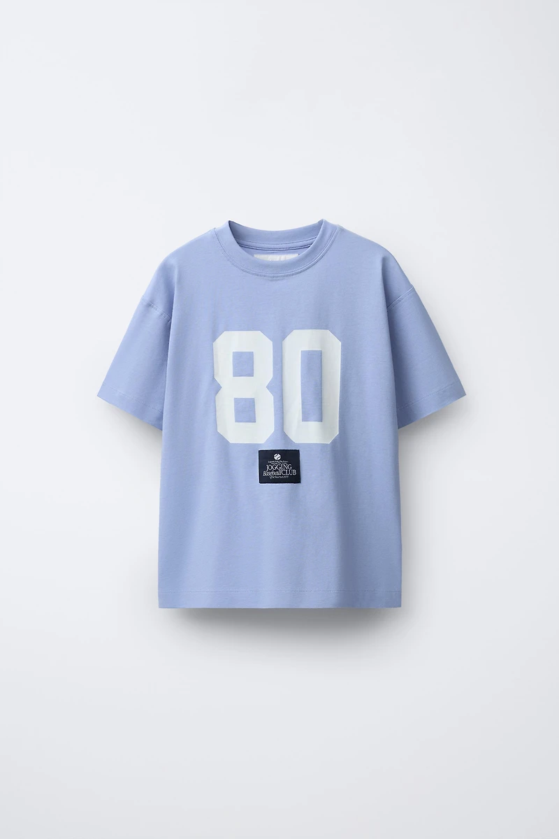 Round neck short sleeve T-shirt. Number print and label appliqué on the front. Main fabric cotton.