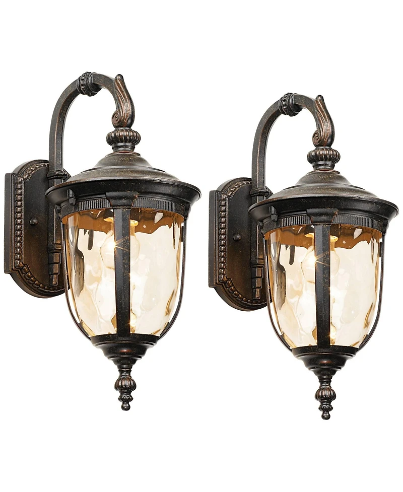 From the Bellagio outdoor lighting collection by John Timberland, this traditional design will add timeless appeal to any home. This set of 2 outdoor wall lights fixture features a handsome, antique-style backplate and downbridge top arm. The combination of champagne hammered glass panels with a bronze finish creates a charmingly vintage look with a sturdy die-cast metal construction.