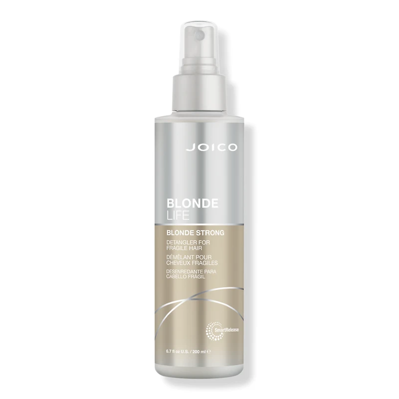 BLONDE LIFE DETANGLER 6.7OZ. Benefits: Detangles and leaves fragile strands feeling hydrated. Helps prevent and mend split ends* (*Until next use). Strengthens hair, making it resistant to breakage** (** Against combing breakage on damaged hair vs. untreated hair). Keeps blonde hair feeling soft and looking bright. 72 hours of frizz-fighting humidity protection ( vs. untreated hair, 85% relative humidity conditions). Protects from damaging UV and heat up to 450 F/ 232 C ( When using thermal styling tools). Key Ingredients: Polycare Split Therapy SPLITCARE POLYMER BLEND - Naturally-derived**, protective polymers help to smooth porous hair, reduce breakage and mend split ends*** (***Until next use). MONOI & TAMANU OIL - A rare, exotic blend of oils and Tahitian Gardenia Flower.. VEGAN SMARTRELEASE TECHNOLOGY - Joico's liposome delivery system goes vegan!The protein element of SmartRelease liposome is now made from pea and vegetable proteins, which mimic the protein found in hair.Thisnew protein is combined with continuously releasing Rosehip Oil and Arginine.. **According to Global ISO 16128 Standard, naturally-derived means that plant and mineral derived materials and water, all of which undergo limited processing.. :