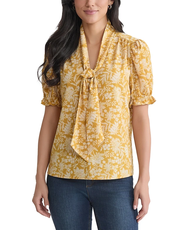Jones New York Petite Printed Tie-Neck Puff-Sleeve Blouse