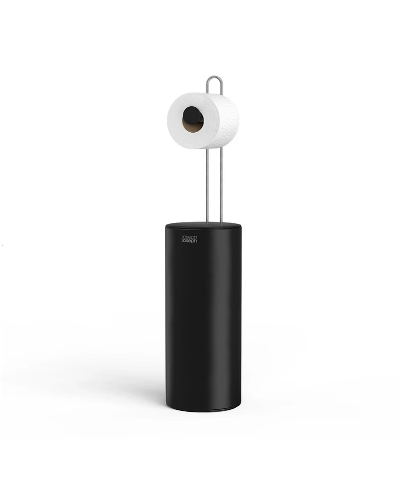 This smart toilet roll storage stand has a stylish finish and is the perfect solution for bathroom organization. The 2-in-1 design holds one in-use roll and stores three more in a hygienic, concealed compartment in its base. Featuring a lift-out finger hook for easy roll replacement, it's ideal for keeping rolls organized and ready to use without the need for a wall-mounted holder.