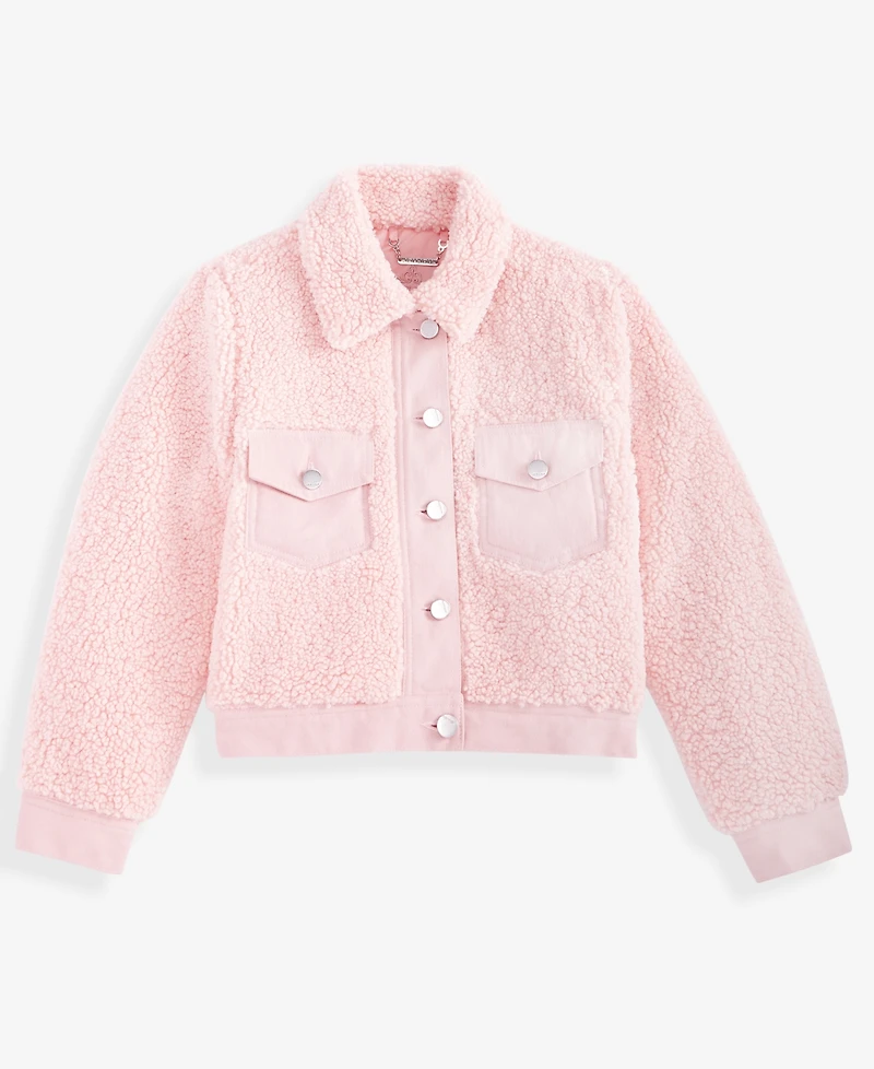 Cozy and stylish, this Jou Jou Sherpa jacket is designed with a center-front button closure for easy wear and a classic look. Two flap buttoned chest pockets add a playful, functional detail.