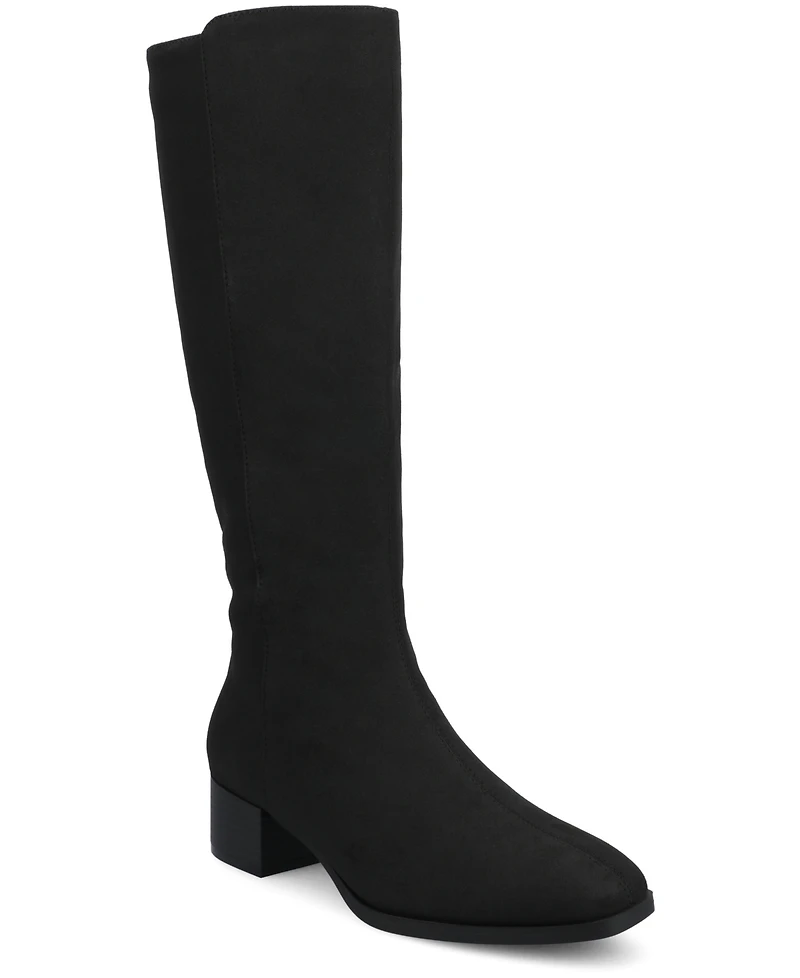 Introducing Devri by Journee Collection, the perfect knee-high boot that is a must-have for the later seasons. These boots feature a chic square-toe design and center seam detail, adding a trendy touch to any outfit. With a convenient zipper entry, Devri provides all-day comfort. Made from soft faux leather and boasting a 1.5"" stacked heel, these boots are the ideal choice to elevate your look. Features a regular calf.