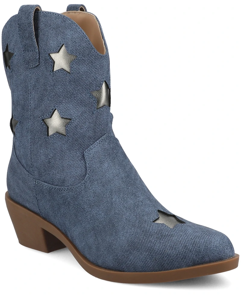 The Underwood western ankle booties by Journee Collection are the perfect statement piece for a night out with the ladies, dancing and singing to the classics. Featuring eye-catching star details, and a sleek pointed toe, these boots bring bold western charm. With a Cuban heel and a 4 mm Journee Collection Comfort System Insole, they offer the ideal blend of style, comfort, and support for all-night fun.
