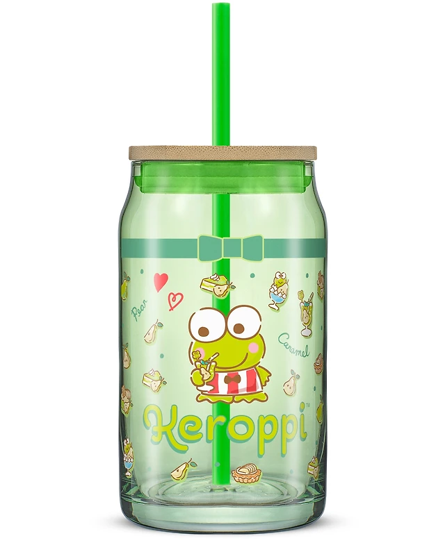 JoyJolt Hello Kitty and Friends Favorite Flavor Keroppi Can Shaped Glass Tumbler with Wood Lid and Straw
