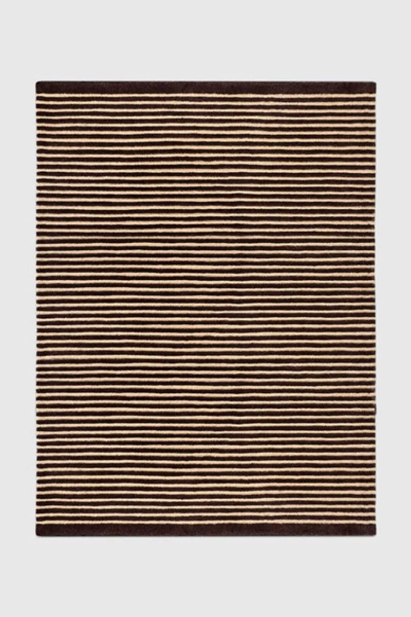 Narrow horizontal stripes in brown and cream run evenly across the surface, creating a steady, linear pattern from edge to edge. The fine striping keeps the layout consistent while allowing the natural texture of the wool to remain visible throughout. Hand-tufted from wool with a plush pile, this rug works easily in living rooms, bedrooms, or studio spaces.